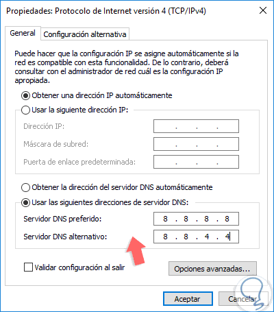 En la nueva ventana desplegada activaremos la casilla “Usar las siguientes direcciones de servidor DNS” y asignaremos las siguientes direcciones IP. Pulsamos en Aceptar para aplicar los cambios.