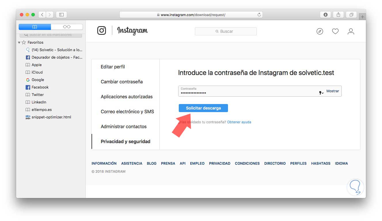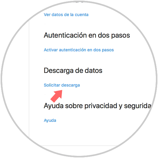 Una vez que nos encontramos en el menú de la privacidad y seguridad, tenemos que desplazarnos hacia abajo para seleccionar en el apartado “Descarga de datos” y seleccionamos “Solicitar descarga”.