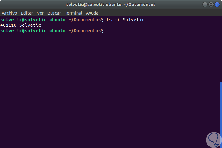 Como alternativa podemos usar el comando ls así. En este caso será desplegado el inodo de dicho archivo. Será necesario tener en cuenta el número de inodo asociado a dicho archivo.