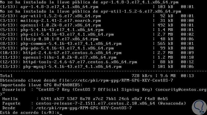 Allí ingresamos la letra Y para confirmar la descarga y más adelante aceptaremos la clave de Apache. Ingresamos la letra S para confirmar la acción.