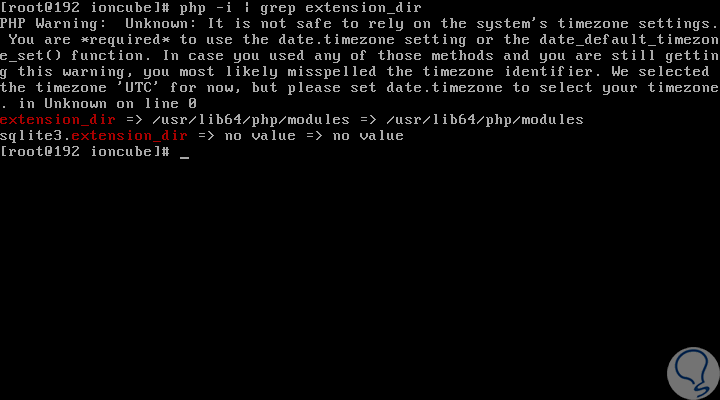 Ahora, vamos a conocer la ubicación del directorio de extensión para PHP versión 5.4, que es donde se instalará el archivo cargador de ionCube, como resultado veremos que el directorio es /usr/lib64/php/modules, ejecutamos lo siguiente: