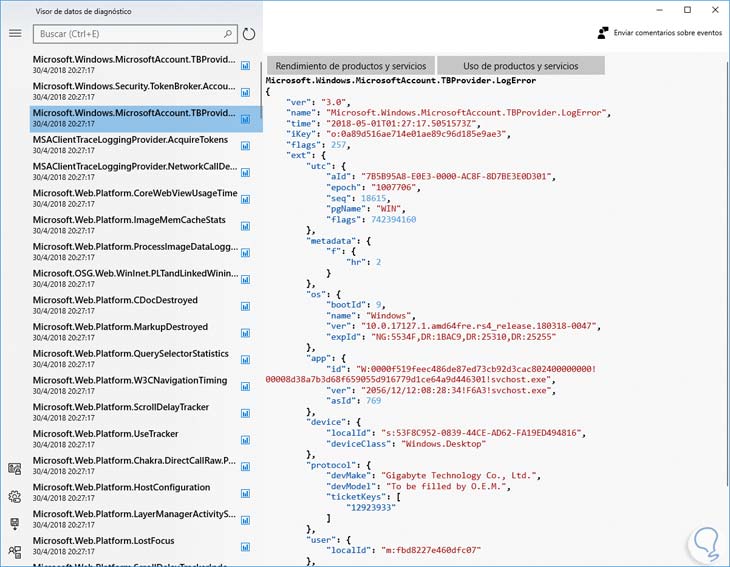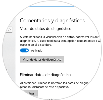 Allí ir a la categoría "Comentarios y diagnósticos". Allí activamos el interruptor "Visor de datos de diagnóstico" y podemos ver la advertencia de uso de espacio en el disco duro, hasta 1 GB, lo cual puede ser perjudicial si contamos con recursos limitados.