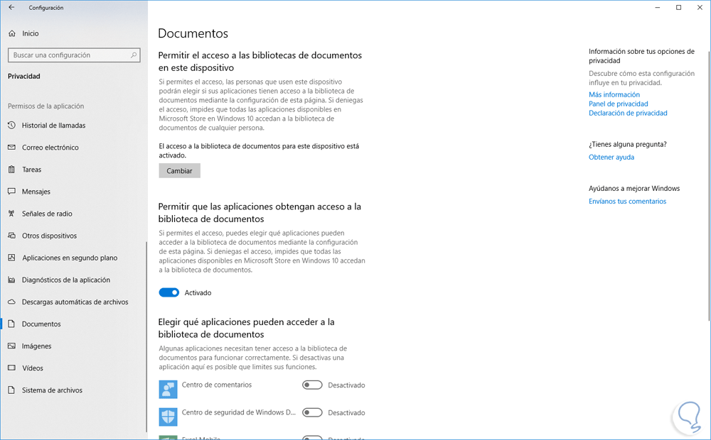 Allí encontramos en la parte final las opciones Documentos, Imágenes, Videos y Sistema de archivos donde será posible configurar que aplicaciones tendrán o no acceso a dichas bibliotecas: