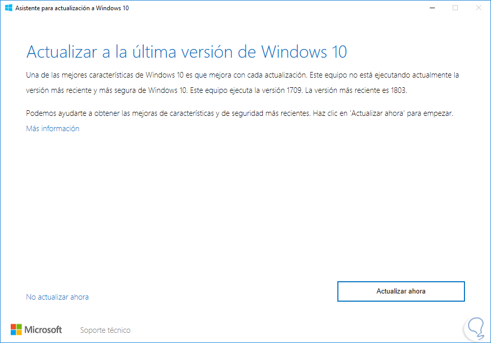 Como vemos allí, se indica que el equipo cuenta con la versión 1709 y la mas actual es la 1803, pulsamos en el botón "Actualizar ahora" y veremos la siguiente ventana donde se habrán realizado los análisis de los requisitos mínimos de instalación: