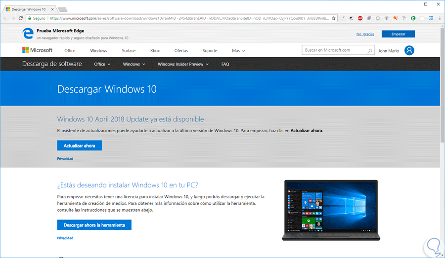 - Desde el sitio web de Microsoft en la opción "Actualizar" en el siguiente enlace: Windows 10 April 2018.
