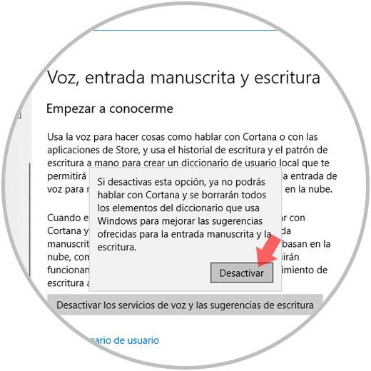 Luego iremos a la categoría "Voz, entrada manuscrita y escritura" donde veremos lo siguiente: Damos clic en el botón "Desactivar los servicios de voz y las sugerencias de escritura"
