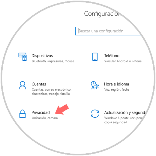 Para llevar a cabo esta acción, iremos al menú "Inicio" y allí seleccionamos la utilidad "Configuración". Vamos a la sección "Privacidad"