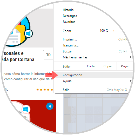 Para iniciar este proceso, pulsamos en el icono “Personaliza y controla Google Chrome” y seleccionamos la opción “Configuración”: