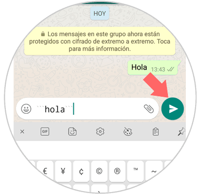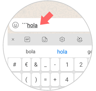 Dentro del chat deberás escribir la palabra o la frase a la que quieras cambiar la fuente añadiendo tres comillas delante y tres comillas al final en la barra de escritura de la aplicación.