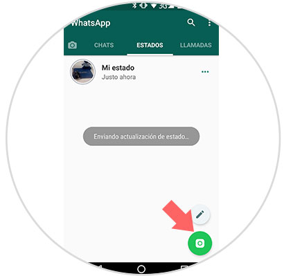 Ahora, entra en la App de WhatsApp y pulsa en la pestaña “Estados”. Aquí pulsa en el icono verde de la cámara de la esquina inferior derecha para subir un nuevo estado.