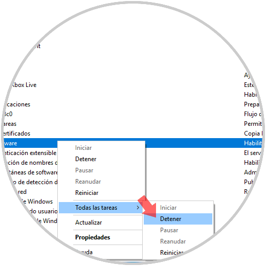 En la ventana desplegada ubicaremos el servicio Protección de Software, daremos clic derecho sobre el y vamos a la ruta Todas las tareas / Detener: