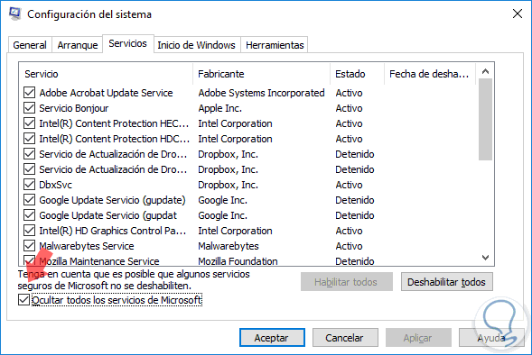 Pulsamos Enter o Aceptar y en la ventana desplegada vamos a la pestaña Servicios y activaremos la casilla Ocultar todos los servicios de Microsoft: