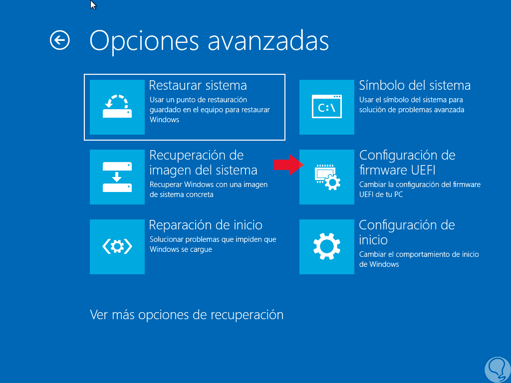 Damos clic en Opciones avanzadas y en la nueva ventana damos clic en la sección Configuración de firmware UEFI: