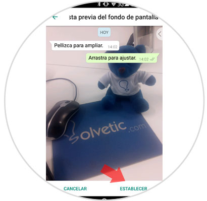 Selecciona la imagen pulsando sobre ella y cuando lo hagas aparecerá en el fondo del chat. Pulsa en “Establecer”