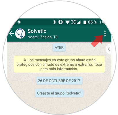 Una vez dentro del chat pulsa el icono de los tres puntos verticales situado en la esquina superior derecha de la pantalla a través de la cual accederás a los ajustes dentro de la App