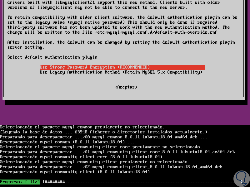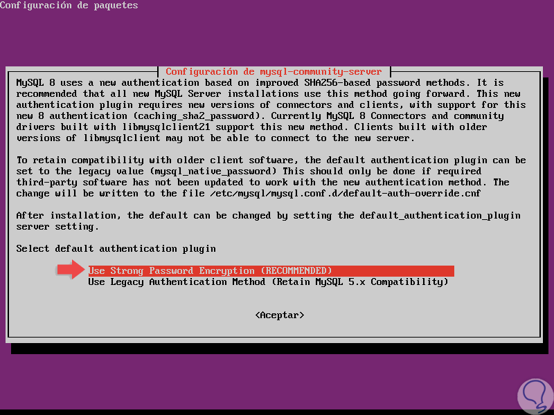 Esto debido al nuevo sistema de autenticación SHA256 de MySQL, allí seleccionamos la opción recomendada y pulsamos Enter para continuar: