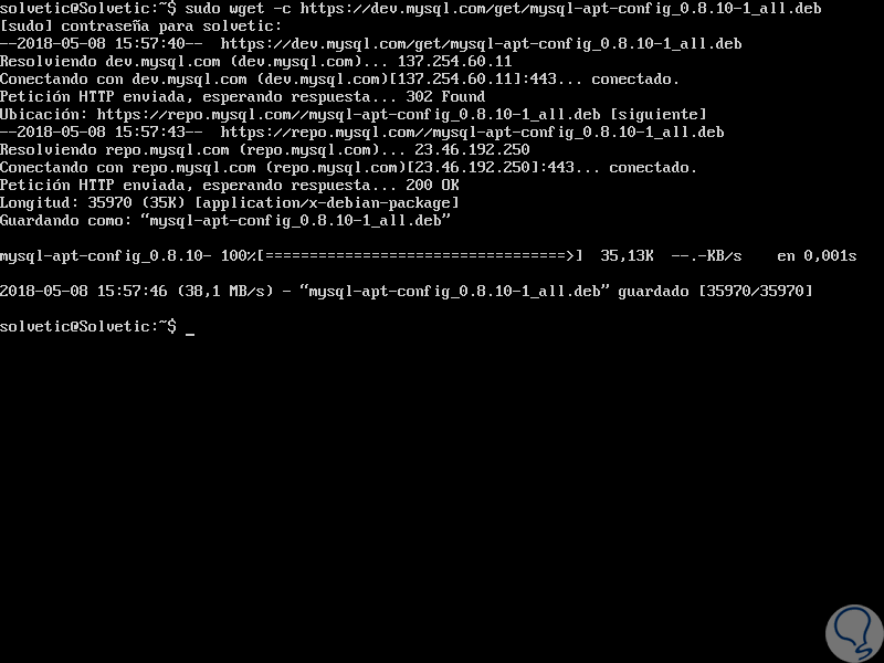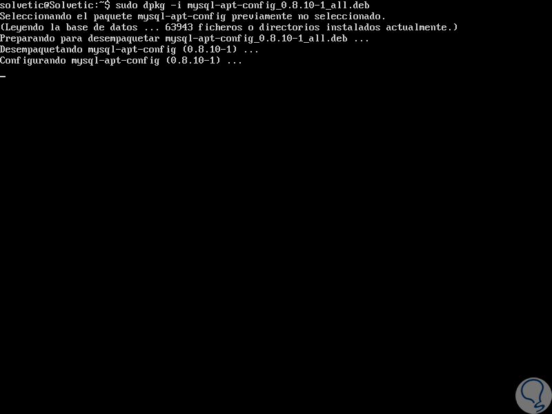 Una vez descargado, vamos a instalar el paquete de repositorio de MySQL 8.0 usando el comando dpkg así: