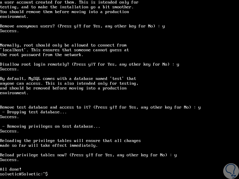 sudo mysql_secure_installationLas preguntas que responder son: