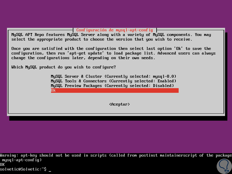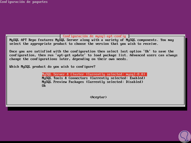 Allí debemos seleccionar la versión del servidor MySQL y otros componentes como clúster, bibliotecas de cliente compartido o paquetes de MySQL que deseamos configurar para la instalación de este, la versión del servidor MySQL mysql-8.0 se seleccionará automáticamente por lo que debemos seleccionar la línea Ok y pulsar Enter para continuar con el proceso de instalación.