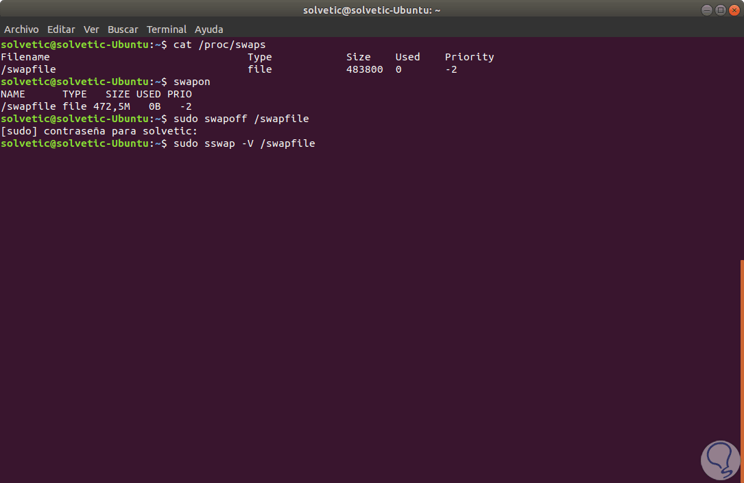 cat /proc/swaps swapon sudo swapoff “partición” sudo sswap -V “partición”
