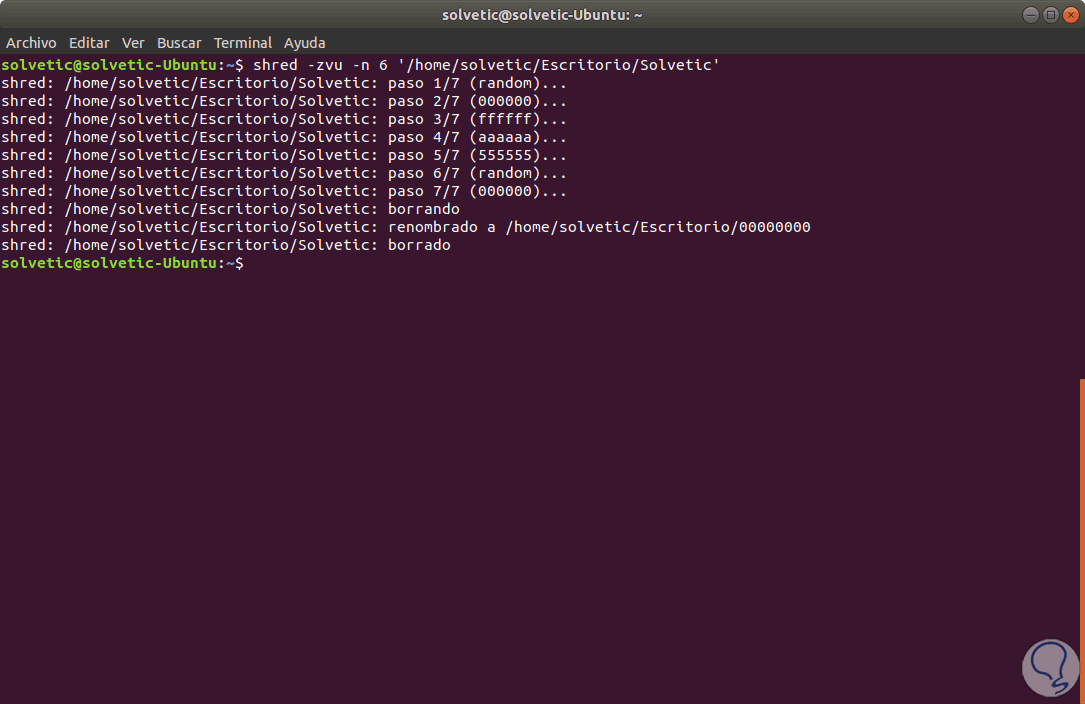 wipe -rfi “Archivo”/*Por ejemplo, vamos a borrar todo el contenido almacenado en el directorio Solvetic1: