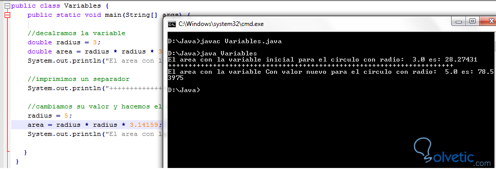 System.out.println("El area con la variable inicial para el circulo con radio: " + radius + " es: " + area);