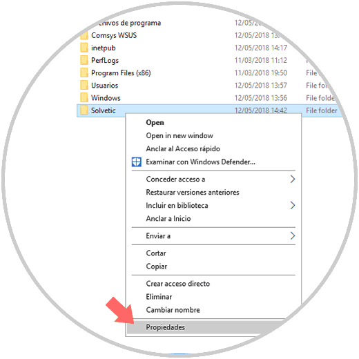 El primer paso a dar consiste en crear una carpeta en el servidor la cual actuara como el servidor de archivos, para ello la creamos y luego daremos clic derecho sobre ella y seleccionamos Propiedades: