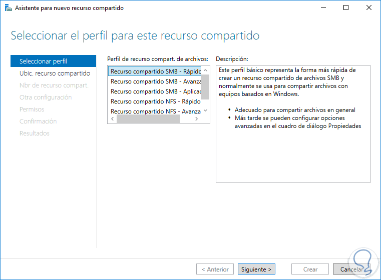 Pulsamos en Siguiente y seguimos los pasos indicados para crear el recurso compartido: