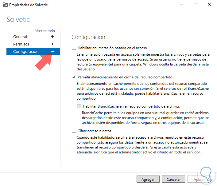 - Habilitar enumeración basada en el acceso: esta opción permite que los usuarios solo vean las carpetas que tiene permiso para ser editadas, las que son de solo lectura estarán ocultas