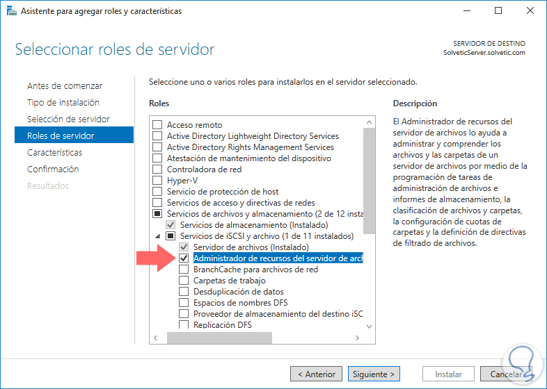 Al pulsar en Siguiente veremos la ventana de Roles de servidor donde ubicaremos la línea llamada Servicios de archivos y almacenamiento, la desplegamos y vamos a la ruta Servicios de iSCSI y archivo y activaremos la casilla Administrador de recursos del servidor de archivos: