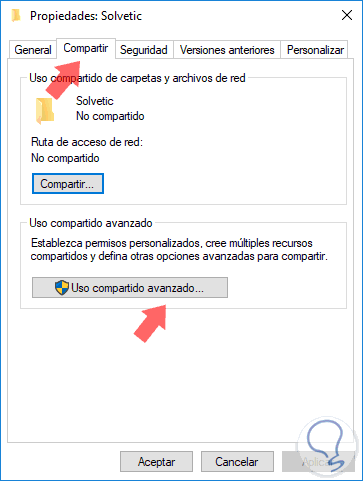 Esto lo hacemos para asignar los respectivos permisos, al pulsar esta opción será desplegado la siguiente ventana donde vamos a la pestaña Compartir: