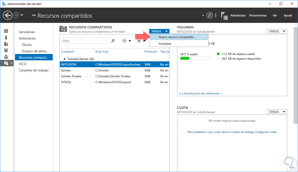 El administrador de archivos nos da la oportunidad de compartir una carpeta directamente desde el, para ello seleccionamos la línea Servicios de archivos y de almacenamiento y en la nueva ventana vamos a la sección Recursos compartidos. Allí desplegamos las opciones del campo Tareas y seleccionamos Nuevo recurso compartido: