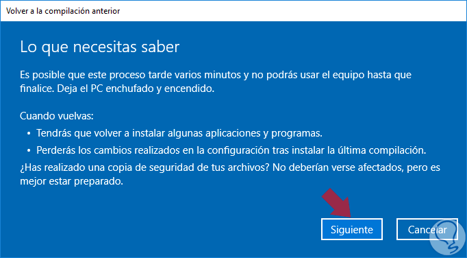 Veremos la siguiente ventana. Allí podemos ver que será necesario instalar de nuevo algunas aplicaciones y al pulsar en el botón Siguiente daremos inicio a proceso de reinicio y restauración a la versión anterior de Windows 10.