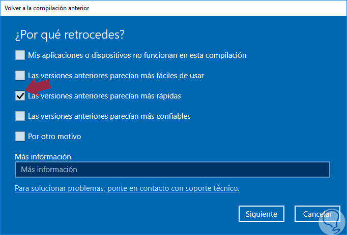 Una vez finalice será necesario seleccionar un motivo por el cual estamos volviendo a la versión anterior, esto será enviado a Microsoft con el fin de mejorar dicho problema. Pulsamos en "Siguiente"