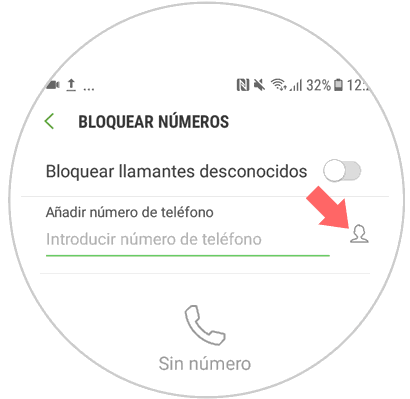 Ahora, al lado de la opción “Añadir número de teléfono” veras un icono de un muñeco que te llevará a la agenda de contactos para seleccionar el que quieres bloquear. Pulsa aquí.
