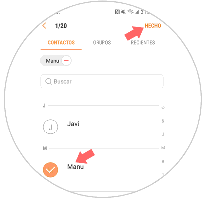 Selecciona el contacto de la agenda de tu teléfono pulsando sobre él. Cuando lo selecciones aparecerá en la parte superior de la pantalla. Pulsa en “Hecho” situado en la esquina superior derecha cuando hayas terminado.