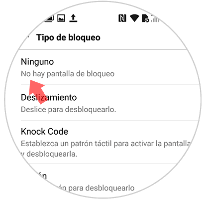 Ahora veremos todas las opciones de bloqueo de pantalla. En el caso de querer eliminar la nuestra, hacemos clic sobre "Ninguno".