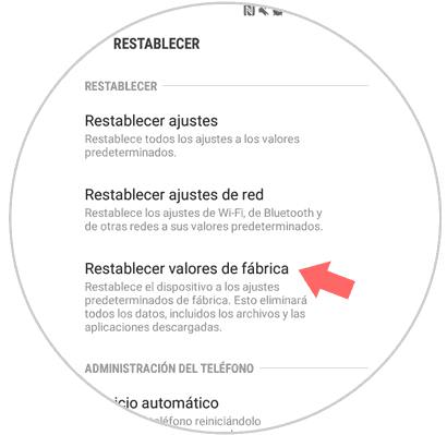 Dentro de la opción “Restablecer” encontrarás “Restablecer valores de fábrica”. Pulsa esta opción para continuar.