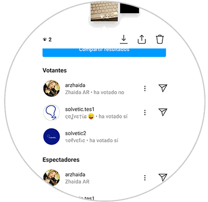 Aquí, vas a poder ver cuantas personas han votado cada una de las opciones dentro de la encuesta, además de ver que personas han visto la encuesta y no han votado. Pulsa en el botón azul “Compartir resultados” para compartir los resultados de tu encuesta en una historia de Instagram.