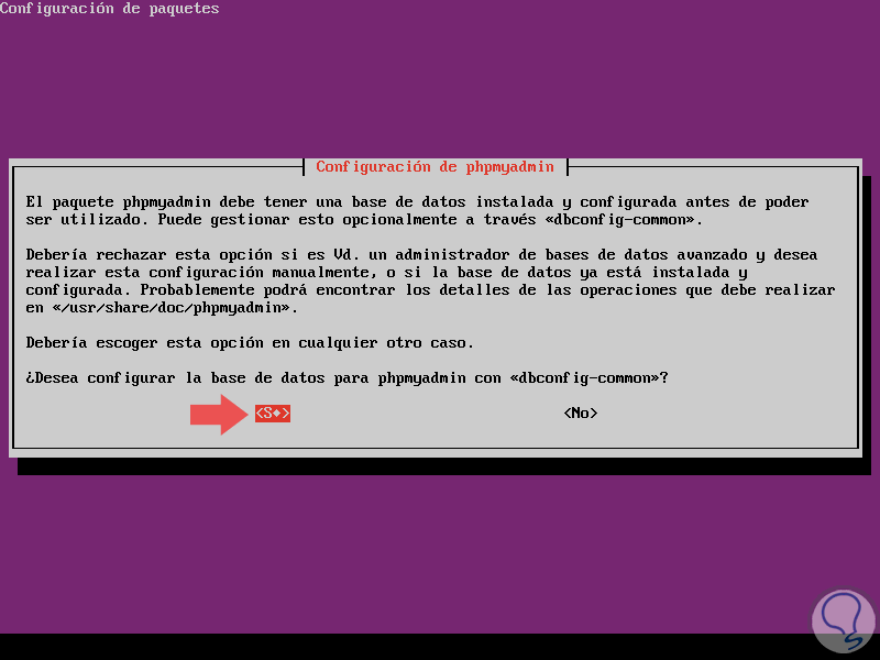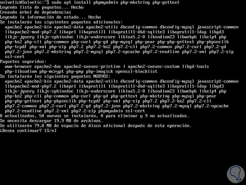 Allí ingresamos la letra S para confirmar la descarga e instalación de todas las dependencias de phpMyAdmin.