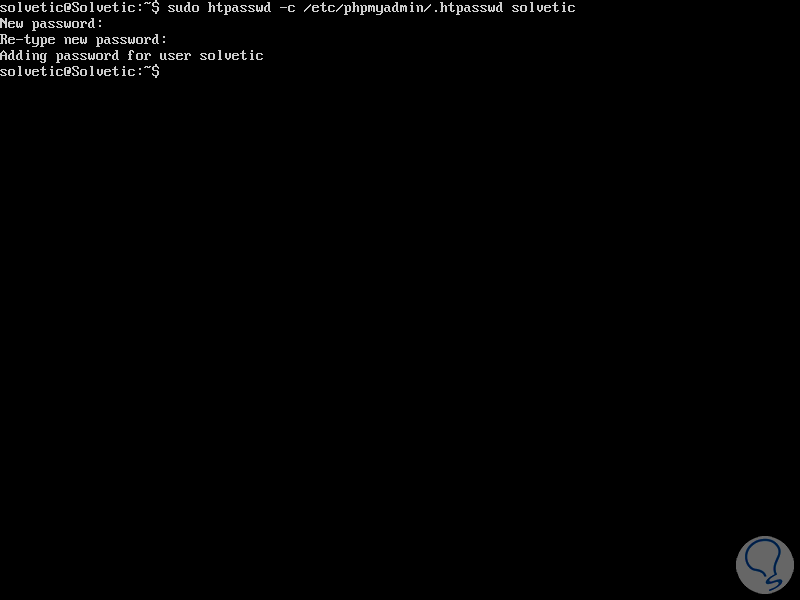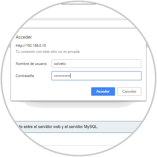 En este ejemplo hemos creado el usuario solvetic, pero podemos añadir los deseamos, de este modo cuando se intente acceder a un subdirectorio en phpMyAdmin veremos la siguiente ventana emergente donde debemos registrar las credenciales del nuevo usuario asignado: