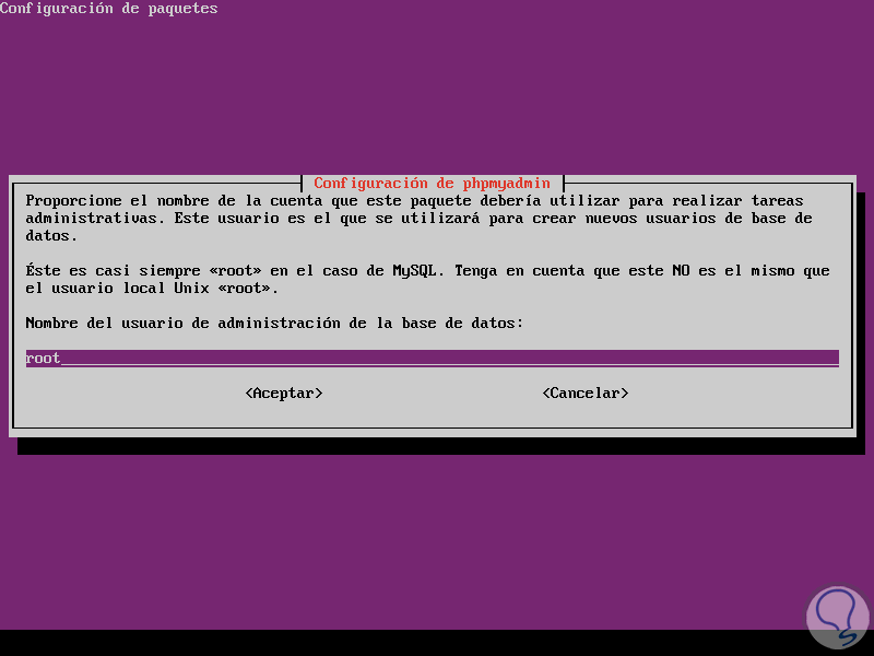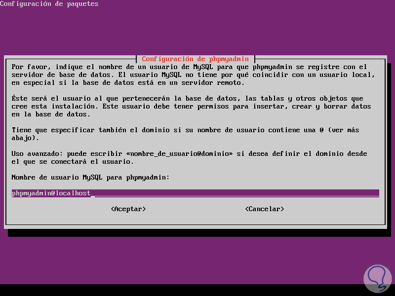 Seleccionamos Aceptar y definiremos el usuario de MySQL para phpMyAdmin: