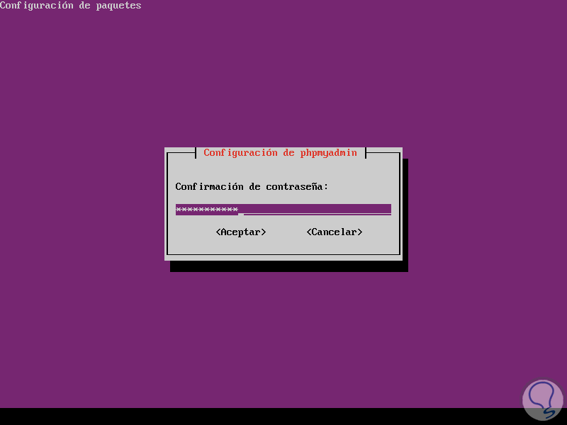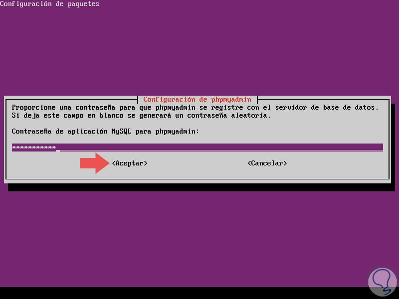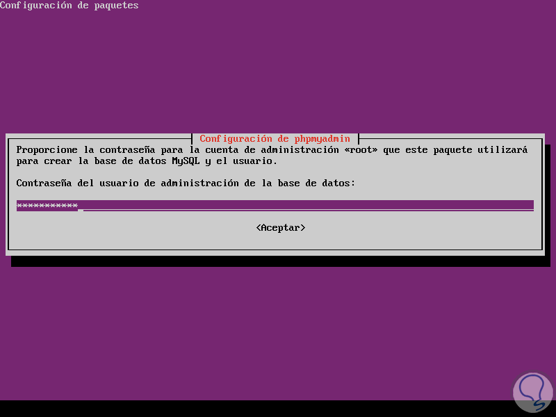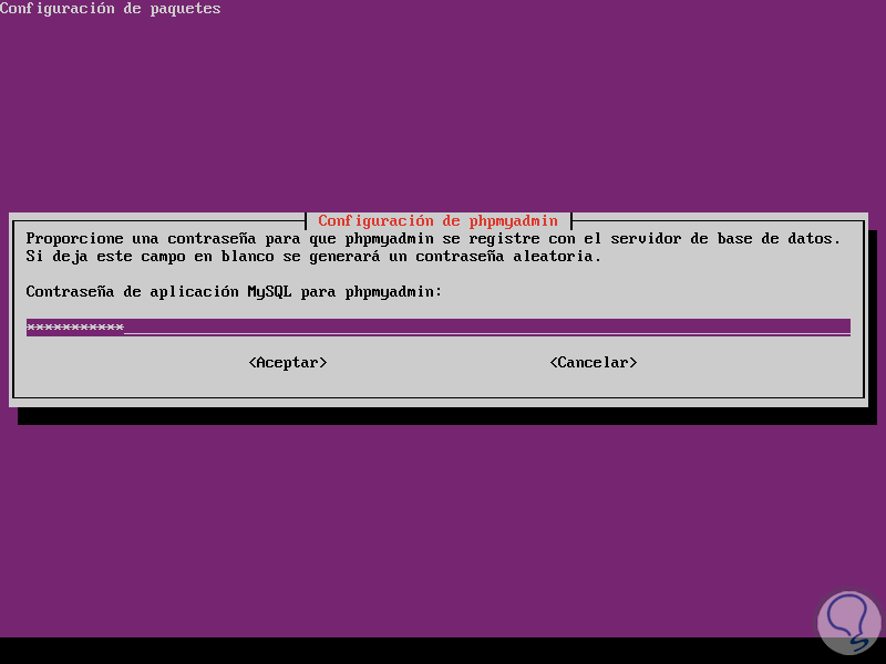 En este caso seleccionamos Si, pulsamos Enter y ahora ingresaremos la contraseña de MySQL para phpMyAdmin: