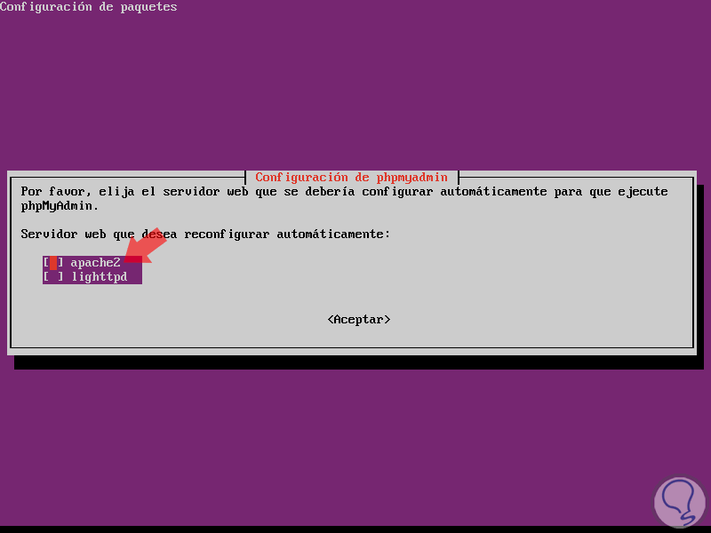 En este caso seleccionamos apache2 con la tecla espacio y pulsamos en Aceptar: