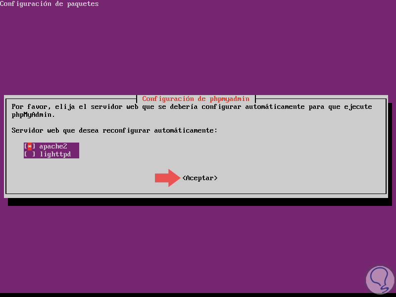 Durante el proceso veremos determinadas preguntas, la primera que era desplegada está asociada al servidor que va a ser configurado para ejecutar phpMyAdmin: