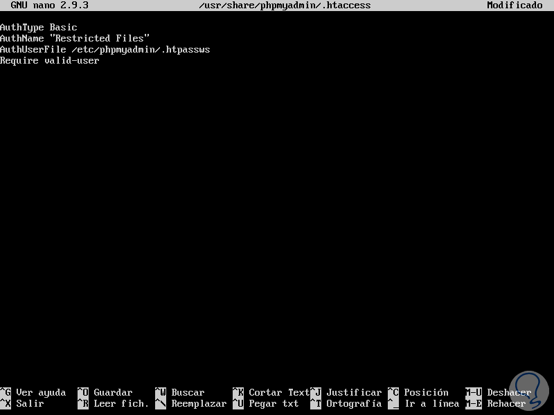 sudo nano /usr/share/phpmyadmin/.htaccessEn este nuevo archivo pegaremos lo siguiente: