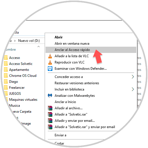 Esta barra de Acceso rápido podemos personalizarla según nuestro gusto para tener acceso a carpetas de uso frecuente, para ello basta con dar clic derecho sobre la carpeta a añadir y seleccionar la opción “Anclar al Acceso rápido”: