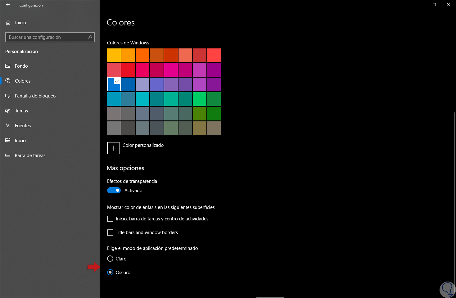 Para establecer este modo oscuro debemos ir a la siguiente ruta: “Inicio / Configuración / Personalización / Colores” y allí activamos la casilla “Oscuro” en la sección “Elige el modo de aplicación predeterminado”: