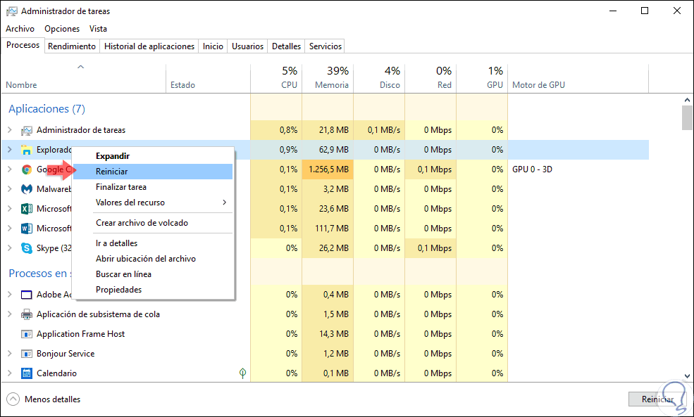 - Dar clic derecho sobre el Explorador y seleccionar la opción “Reiniciar”