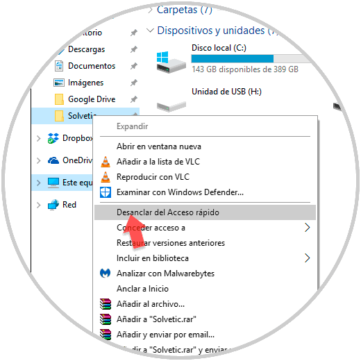 En el momento en que no deseemos contar con esta carpeta o archivo en el Acceso rápido, daremos de nuevo clic derecho sobre ella y seleccionamos la opción “Desanclar del Acceso rápido”: